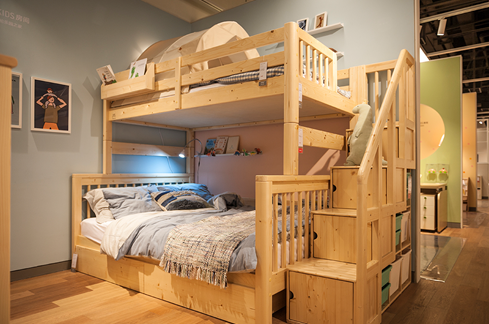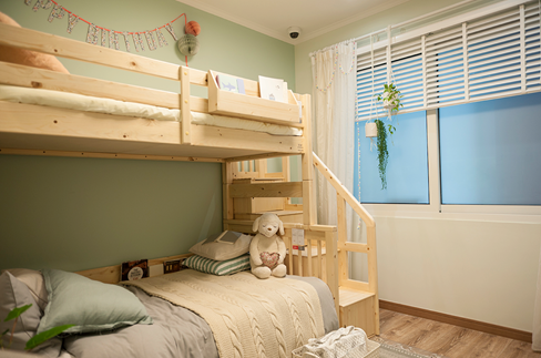 这款原木色的双层床已经是汉森儿童房的招牌,颜值和安全性兼备,有效解决了二胎家庭中空间不足的问题,相信每一个宝宝看到这张床会立刻爱上这里。