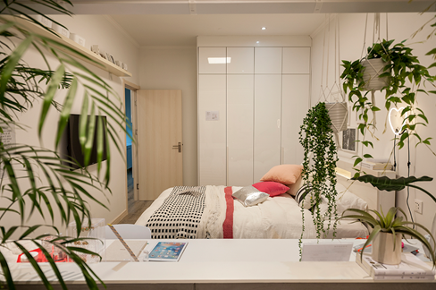 比如,新婚的家庭,会设计出两人既有独立的空间,又有分享交流的空间。房间里布置得很紧凑,有床、衣柜,还有书桌的布置,让两个人看书、玩电脑完全互不干涉。