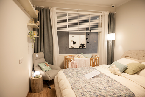 主卧设计的是婴儿床在父母床的旁边,方便妈妈照顾宝宝。