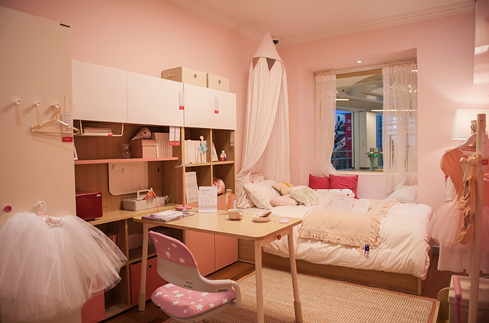 7-13岁的孩子上小学了,这个时候需要安排一个孩子独立的房间,尽量营造一些学习的氛围,例如提供一张多功能书桌,培养他们独立自主的个性。7-13岁子女家庭样板房的房间,布置的是女儿最爱的公主风。